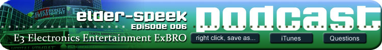 In this Spectacular E3 predictions edition of the Elder-Speek podcast we dedicate the entire show to our personal predictions on what E3 2009 introduce. We go over what we think the big three will announce in their press conferences, we tackle the third party publishers and predict the “winner” of E3 2009.