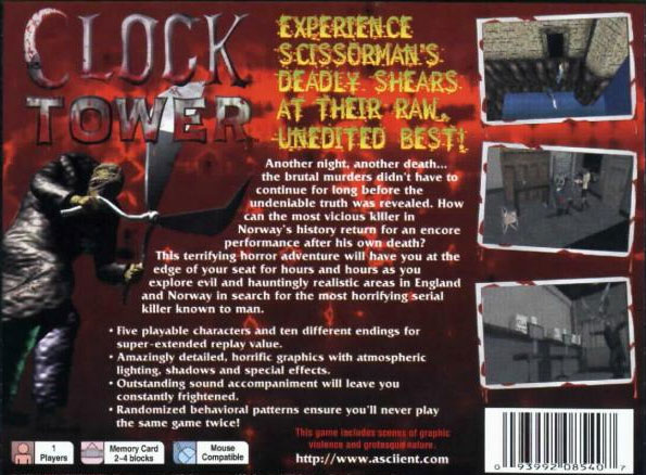 Clock Tower is a sequel to Clock Tower: The First Fear for the SNES which wasn’t released in America or Europe. In Clock Tower, you can play as Jennifer Simpson, one of the two survivors from the Scissorman murders in the first game—the other survivor being an eight year old boy called Edward. You can also play as Helen Maxwell, the assistant to the police psychologist. At the start of the game, Scissorman tries to attack Helen and Jennifer at the police department. You have to discover why Scissorman is back and how to stop him.